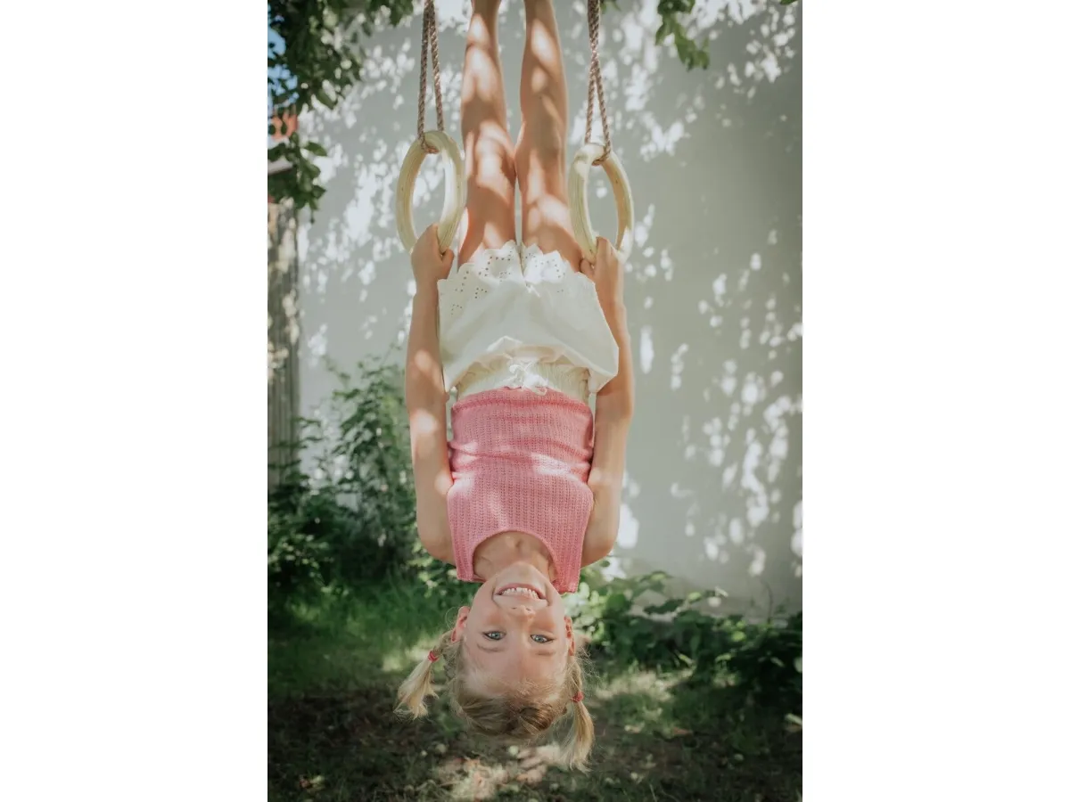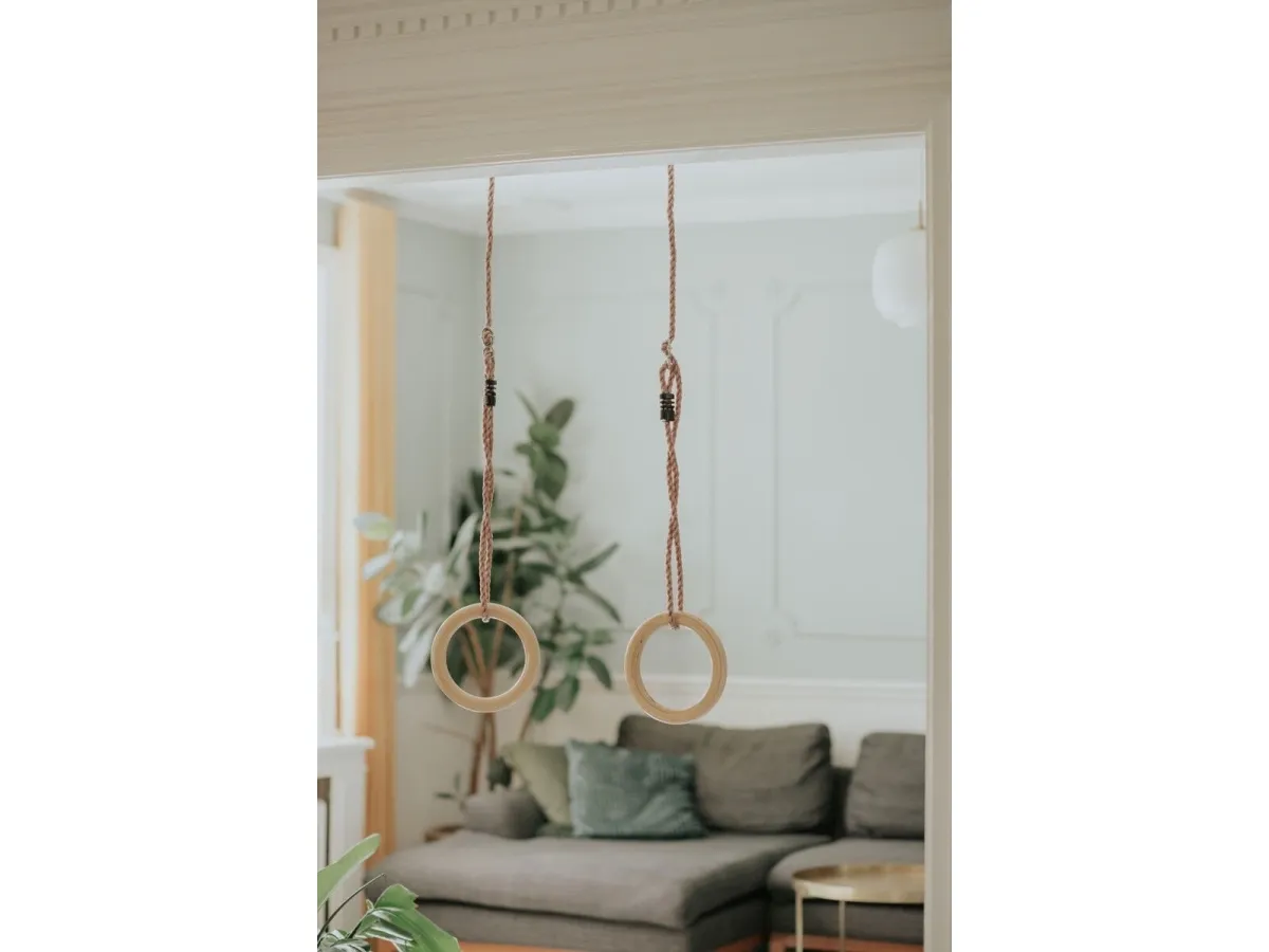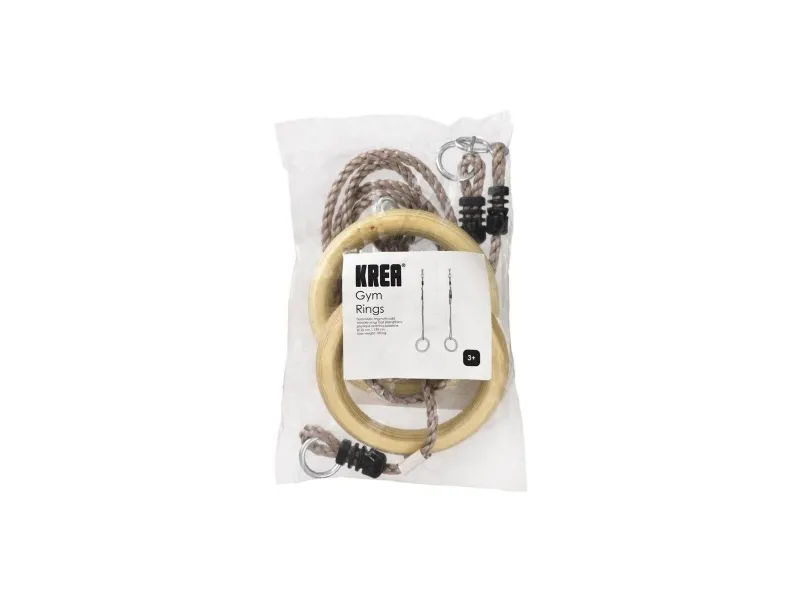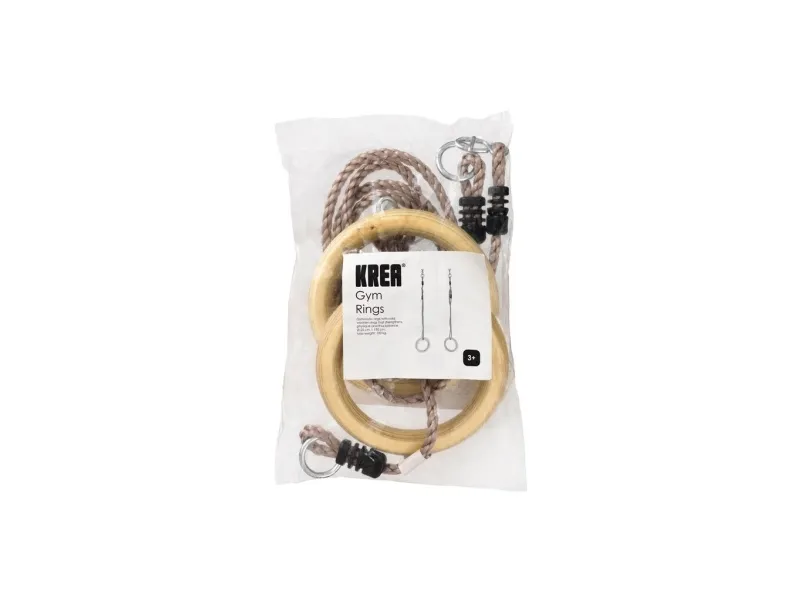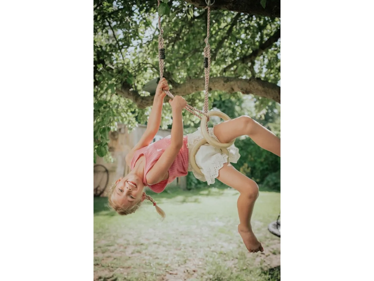 The gymnastic rings have solid wooden rings and ropes in durable PE, and when children play in the rings, they not only have fun doing cool tricks, the play also strengthens their physique and thus balance. Ø 28 cm, L 195 cm. Max weight: 100 kg.