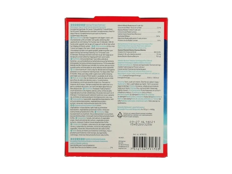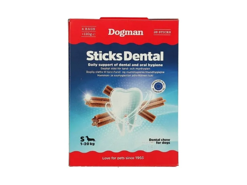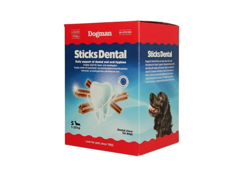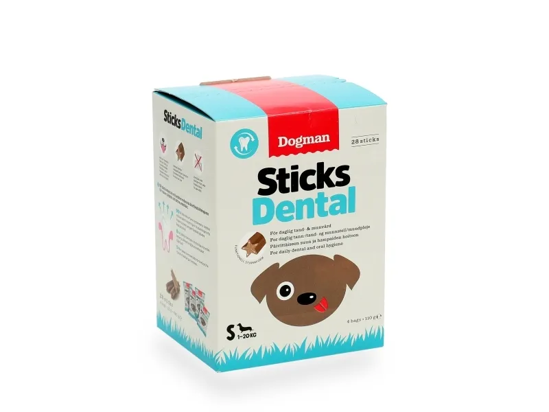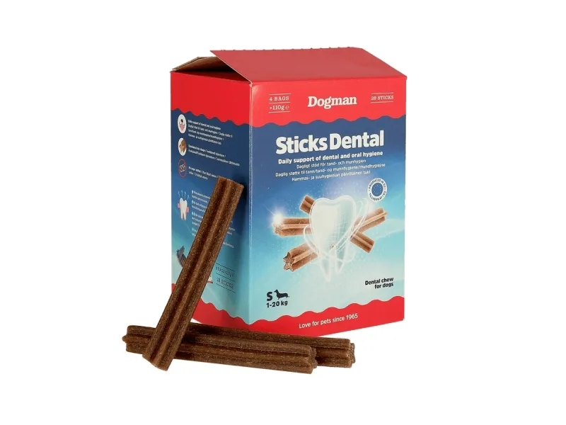 Sticks Dental auttaa poistamaan plakkia ja rajoittamaan hammaskiven muodostumista. Toiminnallinen tähden muoto ja aktiivinen plakkia vähentävä ainesosa, joka tunkeutuu syvälle ja puhdistaa. Keskikokoisille ja suurille koirille > 20 kg. 1 Sticks Dental / päivä.