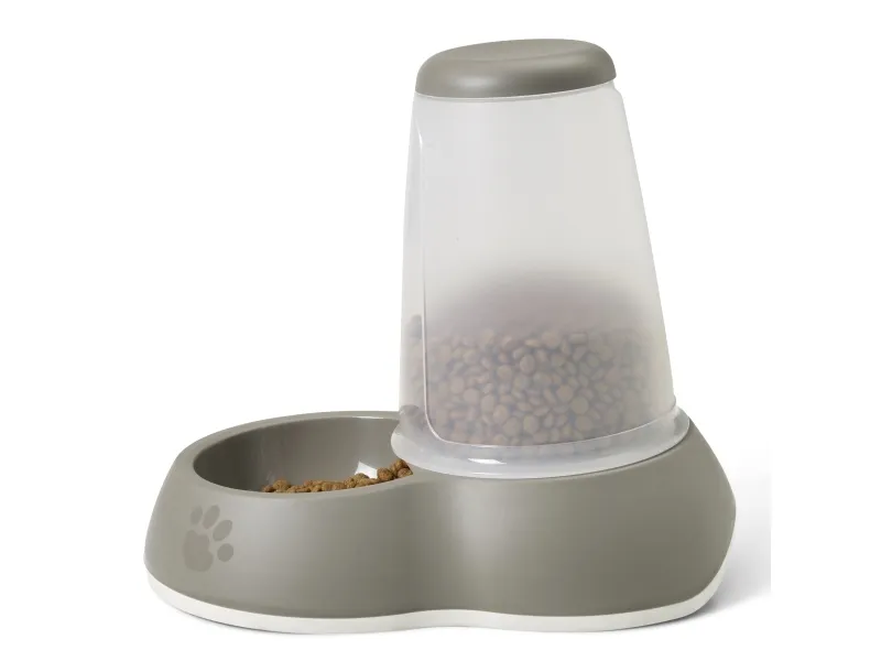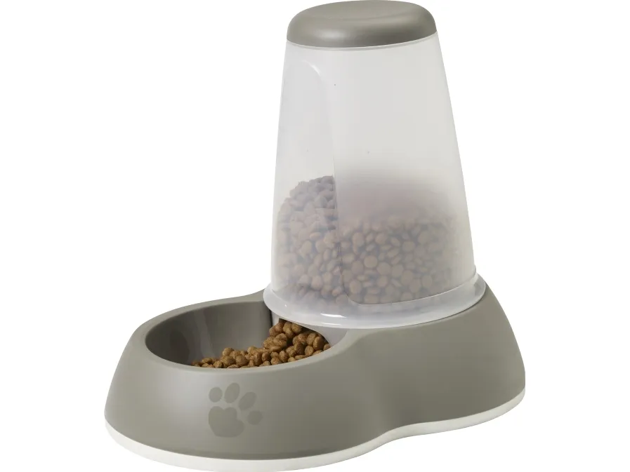 Nykyaikainen automaattinen ruokinta-automaatti, joka antaa koiralle/kissalle ruokaa, kun se on nälkäinen. Ruokasäiliö on läpinäkyvä, joten näet helposti, milloin ruokaa on täytettävä. Kulhossa on integroitu kumipohja, joka seisoo vakaasti.