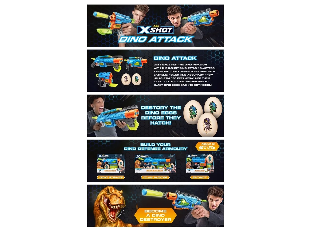 SUORITUSKYKY: Dino Extinct Blasterin ampumaetäisyys on uskomaton 27 metriä, ei ihme, että X-SHOT-blasterit ovat kolminkertaisia tikkaalueen palkinnon voittajia.