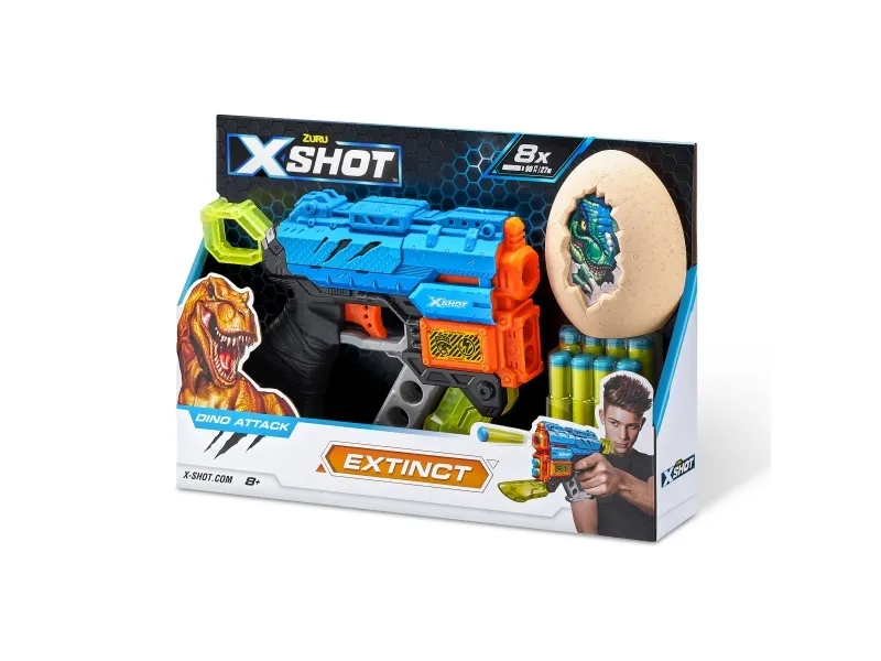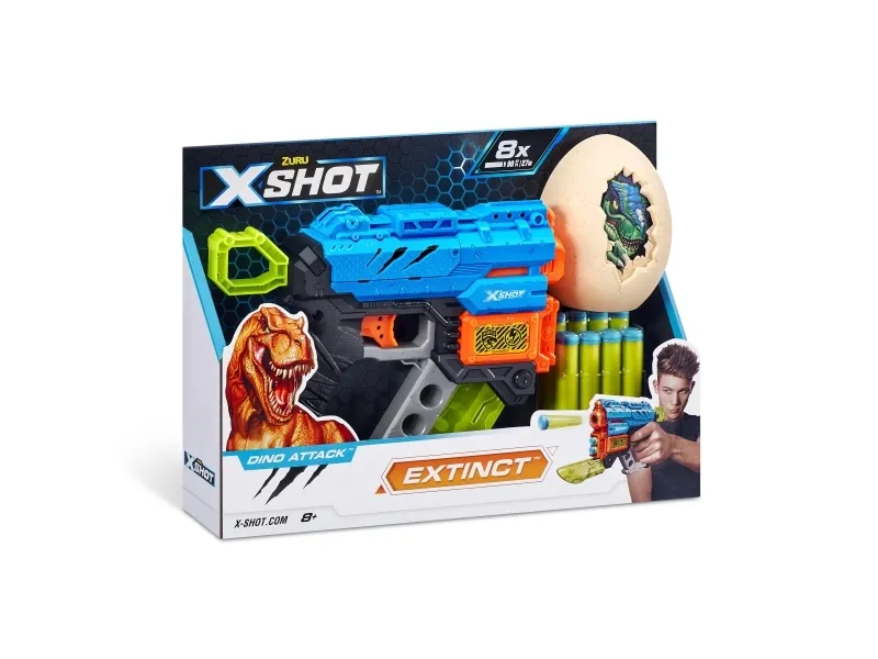 1 x X-Shot Dino Attack Dino Extinct Blaster, 8 x X-Shot Vaahto nuolet, 1 x Dino Egg