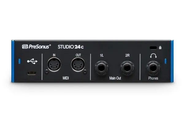 Professional quality in your home recording studio and on the go.Great for recording studios, mobile musicians, guitarists, podcasters, and live streaming, the bus-powered Studio 24c 2-in, 2-out audio interface features 2 front-panel combo mic/line/instrument inputs with PreSonus® XMAX-L solid-state mic preamps, 2 rear-panel line outputs, MIDI I/O, and onboard direct monitoring control. A complete, all-in-one home recording studio, the Studio 24c comes with PreSonus’ award-winning Studio One® Artist music production software for macOS® and Windows®.World-class recording software included.Seamlessly integrated with the included PreSonus Studio One Artist music production software, the Studio 24c interface works with virtually all macOS and Windows recording software. Easy to learn, Studio One enables you to compose, record, and produce without getting distracted by the tools. Need a new loop or sample for your latest production? Studio One lets you shop, audition, and purchase new content right from your production environment.Take the tour.The 2-in, 2-out Studio 24c audio interface features USB-C computer connectivity and includes combo mic/instrument/line inputs with +48V phantom power for condenser mics; balanced, ¼-inch TRS, line-level main outputs; and an output level control. Its built-in MIDI interface enables connection to a keyboard, sound module, or control surface. A Mixer knob blends analog input and computer playback for low-latency monitoring.Superior sound.The Studio 24c operates at up to 192 kHz for ultra-high-definition recording and mixing. High-quality converters on every input and output and PreSonus’ professional-grade XMAX-L mic preamps enable you to capture complex musical harmonics smoothly and naturally, with no audible distortion.Designed for the home recording studio. Built for the road.Whether you're just getting into recording or are a veteran producer who wants to go mobile, the Studio 24c will give you clear, clean, ultra-high-def sound in a bus-powered, rugged unit. While it’s a perfect companion for any recording software, the Studio 24c and included Studio One Artist provide you with a complete, affordable, home and mobile recording solution.Includes Studio Magic Plug-in Suite.This suite of plug-ins adds a wealth of fresh sounds and effects to Studio One. Cherry-picked from the first names in virtual instruments and effects, each plug-in brings a different flavor of practical magic to your songs. These plug-ins aren't gimmicky one-trick ponies — these are real-deal workhorses that you'll rely on for countless mixes.PreSonus Studio 24c. Form factor: Desktop, Product colour: Black, Housing material: Metal. Device interface: USB. Microphone preamp gain: 50 dB, Microphone preamp input level (max): 10 dBu, Microphone preamp input impedance: 1400 Ω. Audio A/D Converter (ADC): 24-bit/192kHz, Supported sample rates: 44.1,48,88.2,96,176.4,192 kHz, A/D dynamic range: 108 dB. Power source: AC