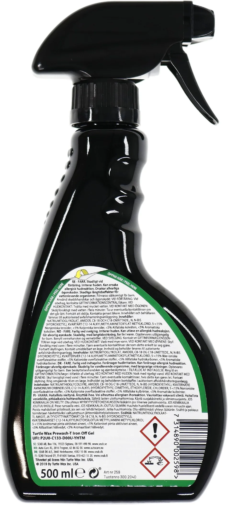Turtle Wax Iron Off Gel poistaa tehokkaasti maaliin ja vanteisiin tarttuneen jarrupölyn ja metallihiukkaset, jotka tunnetaan paremmin nimellä lentoruoste. Suihkuta päälle ja odota, että tuote vaihtaa väriä. Iron Off Gel -geelillä on geelimäinen koostumus, joka saa sen tarttumaan autoon maksimaalisen vaikutuksen aikaansaamiseksi, sekä happovapaa ja pH-tasapainotettu koostumus.