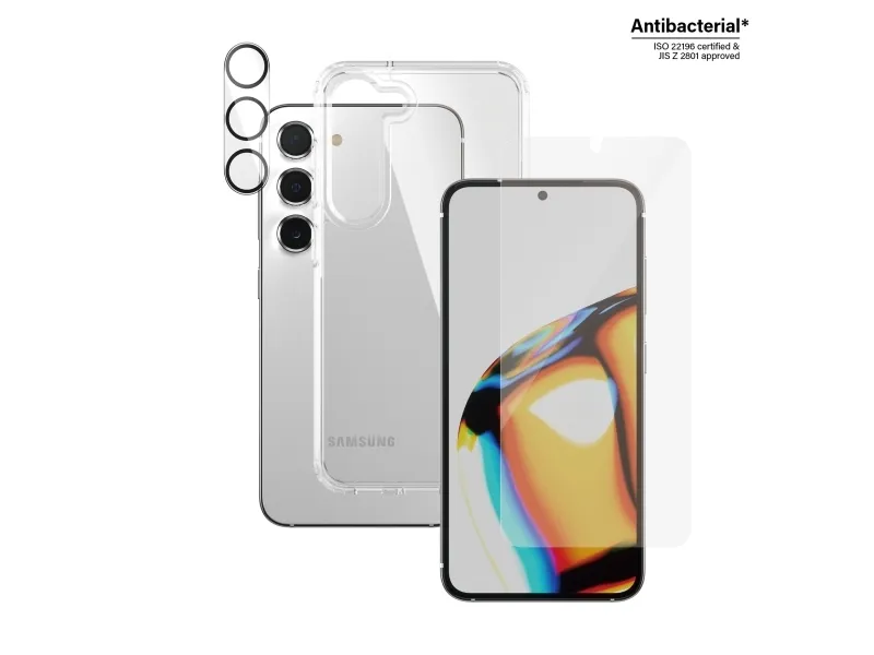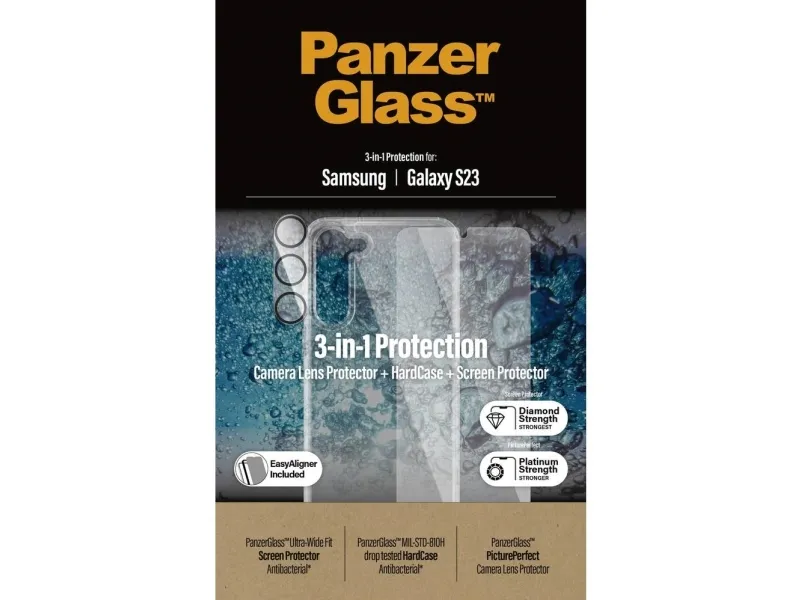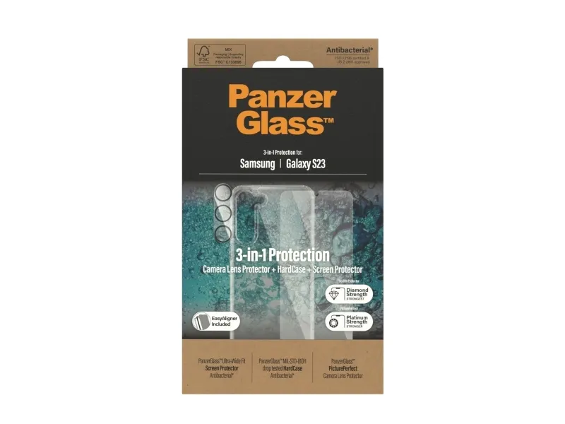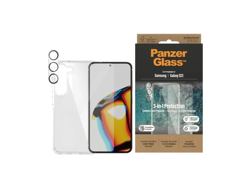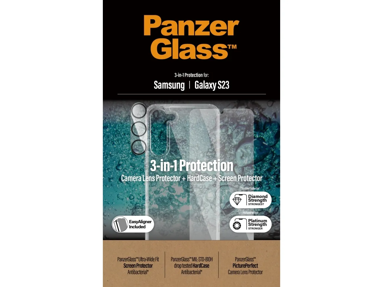 PanzerGlass HardCase+ Screen Protector Samsung G. S2023, Samsung, Samsung - Galaxy S23, Asennus kuivana, Naarmuuntumisenkestävä, Iskunkestävä, Antibakteerinen, Läpinäkyvä, 1 kpl