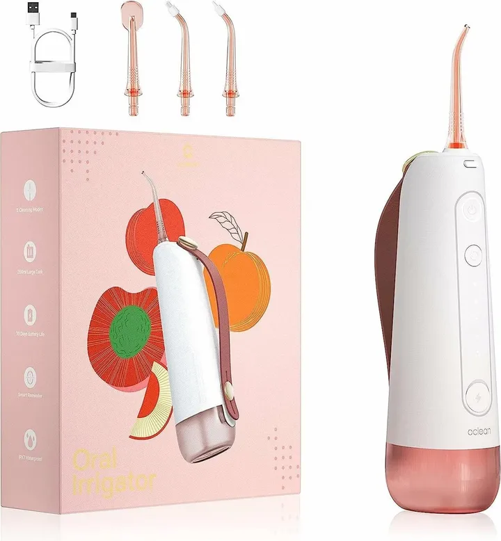 Oclean W10. Water tank capacity: 0.2 L, Product colour: Pink, White, Product type: Cordless oral irrigator. Power source: Battery, Power consumption (typical): 2.5 W, Battery technology: Lithium-Ion (Li-Ion). Width: 56 mm, Depth: 77 mm, Height: 268 mm. Number of heads: 4 head(s)