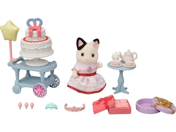 Smokkikissatyttö Lily järjestää mahtavat juhlat ja kutsuu kaikki ystävänsä. Hän on leiponut herkullisen kakun ja keittänyt teetä. Ystävät tuovat mukanaan ilmapallon ja muita lahjoja. Kakku voidaan tarjoilla kaksikerroksisena tai kahtena eri kakkuna. Kakut koristellaan setissä toimitetuilla koristeilla. Sylvanian Families juhlat-leikkisetti sisältää tarjoiluvaunun ja kakun sekä erilaisia kakkukoristeita, bistropöydän, 2 lahjaa, ilmapallon, teekuppeja ja teekannun, kruunun ja smokkikissatyttöhahmon. Samettisen pehmeä hahmo on kooltaan n. 6 cm. Pää, kädet ja jalat liikkuvat. Hahmon vaatteet voidaan pukea ja riisua. Ei sovellu alle kolmevuotiaille lapsille. • upea juhlaleikkisetti, jossa tarjoiluvaunu, täytekakku, pöytä, astiat ja muita juhlatarvikkeita • sis. smokkikissatyttöhahmon • koko n. 6 cm • liikkuvat pää, kädet ja jalat