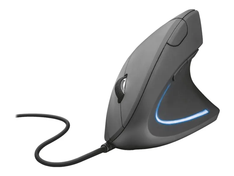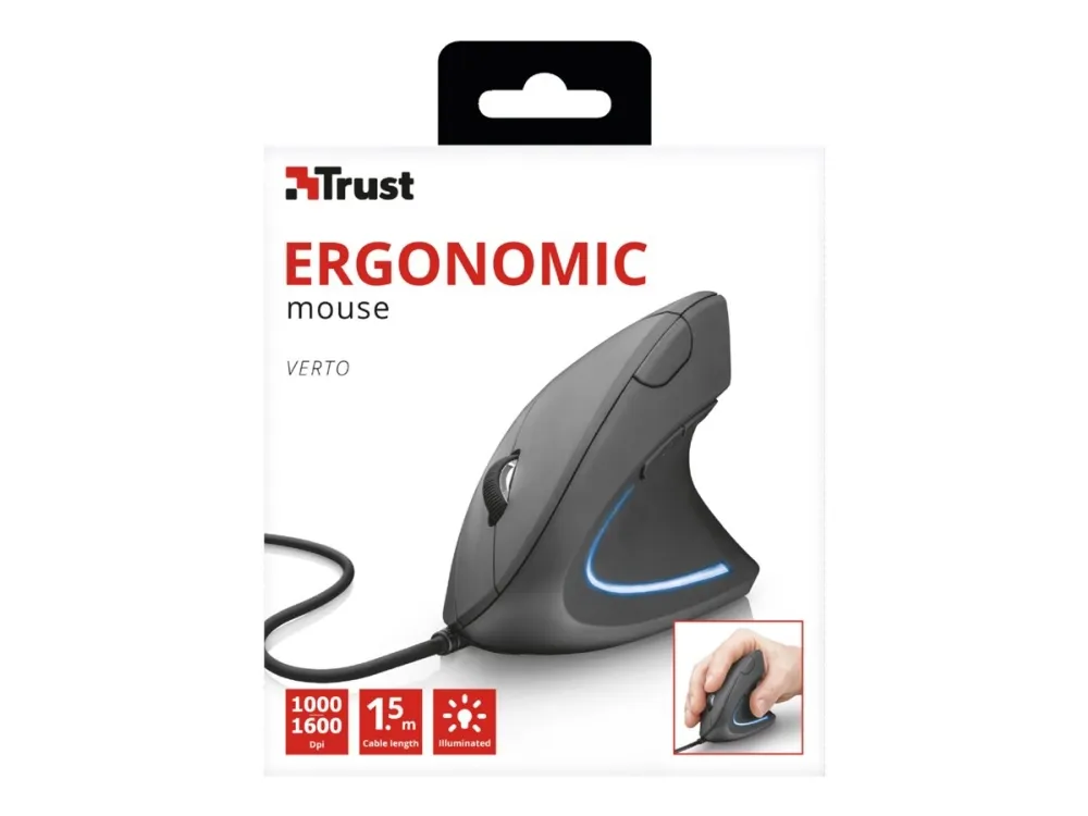 Mouse with ergonomic vertical design to reduce arm and wrist strain.Work naturallyWith the Trust Verto Ergonomic Mouse, you can work ergonomically for hours. This mouse is made to reduce arm and wrist strain for ultimate comfort during those long working days. Your hand will remain in a natural position while using this mouse. Choose optimal control and comfort! Thanks to its ergonomic design and comfortable thumb rest, you can work or study effortlessly for hours at home or at the office. The vertical layout brings your underarm and wrist into a natural position which relaxes the muscles in your hand, wrist and arm. The rubber coating of this mouse makes sure your grip remains firm while working for longer periods of time.Accurate controlWho said ergonomics was boring? Simply plug in the mouse and you have access to a 1000/1600 dpi optical sensor for accurate control. Switch dpi with the dedicated button or browse quickly through different web pages with the two thumb buttons.Plug & PlayConnect the Verto with the 1.5m USB cable and you can start working instantly. The LED illumination lights up your mouse with attractive blue light! Trust Verto. Form factor: Right-hand, Vertical design. Movement detection technology: Optical, Device interface: USB Type-A, Movement resolution: 1600 DPI, Buttons type: Pressed buttons, Buttons quantity: 6, Scroll type: Wheel. Power source: Cable. Product colour: Black