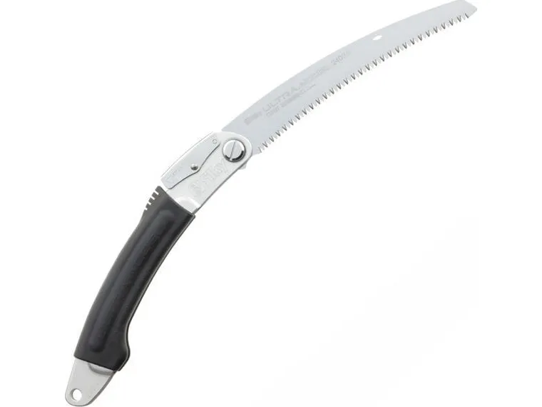 The Ultra Accel 240 mm Curve is a saw with the folding action needed for portability, but with a sturdy aluminum chassis and large teeth to give it the cutting power and stability of a fixed-blade saw. The Japanese steel blade features impulse-hardened large teeth that make slicing through a limb quick and easy. The gentle curve of this version of the Ultra Accel is designed for faster cutting while in the canopy of a tree, or anytime where you're cutting things that are above shoulder height.Silky 446-24. Product type: Pruning saw, Suitable for materials: Wood, Blade material: Stainless steel. Blade length: 24 cm, Length: 505 mm, Weight: 281.22 g