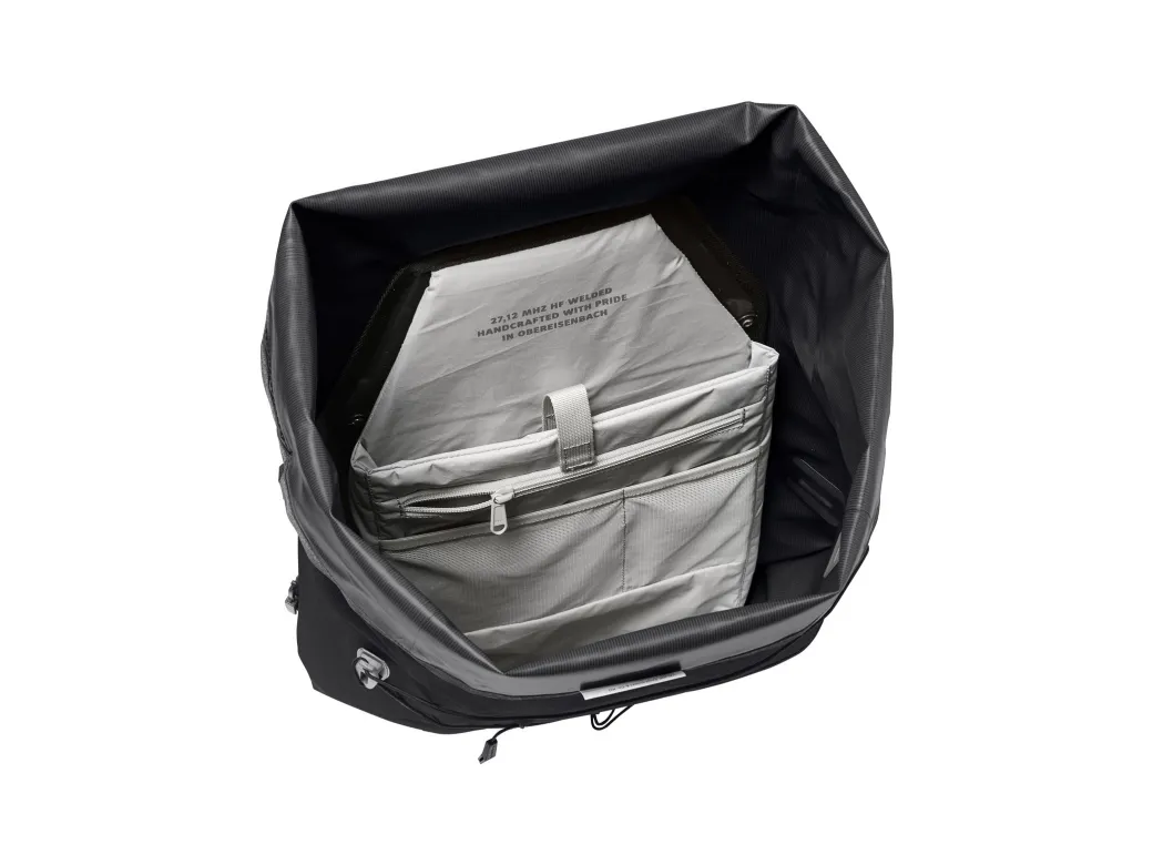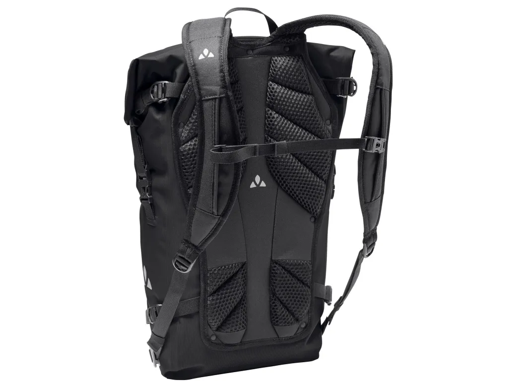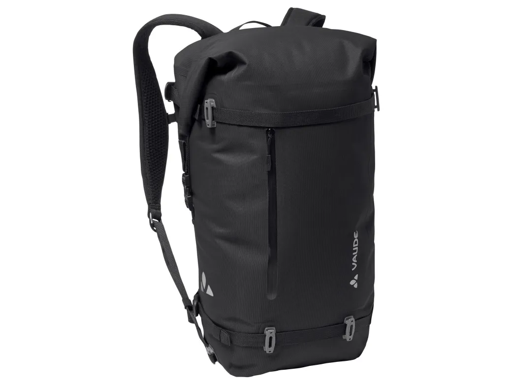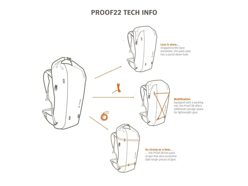 Proof – the name says it all! This waterproof backpack in a no-frills design is a true all-rounder for city, bike, trail and mountain – in any weather! For smaller people or when carrying a heavier load, the comfortable Ergoshape shoulder straps and strategically placed back padding offer a stable fit even without a hip belt. Compression straps at the bottom and top help you to secure your load depending on the pack volume. The foolproof roll closure can be snugged down at the side or clipped together at the top, providing quick access to the main compartment. There's a padded compartment for laptops up to 13.3" inside at the back as well as one zip and one slide-in compartment for securing small items. A waterproof hf-welded slide-in pocket at the front holds a protein bar, map or your GPS. In addition, 4 integrated multi-purpose straps included in delivery can hold extra gear like a helmet, jacket or make a good place to store wet clothing. Reflective logo prints are located at the front and sides for extra visibility in the dark. The extremely abrasion-resistant, bluesign®-certified primary material consists of 68% recycled Econyl. The Proof 22 is made with fully waterproof, hf welding with eco-friendly manufacturing at the company's headquarters in Germany. VAUDE Proof 22. Backpack type: Cycling backpack, Product main colour: Black, Style: Sport. Width: 480 mm, Depth: 330 mm, Height: 210 mm. Quantity per box: 1 pc(s)